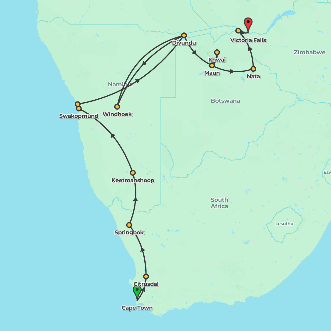 An overland safari from Cape Town through Namibia and Botswana to Victoria Falls, blending desert wonders and wildlife-rich parks with mixed camping and lodge stays.