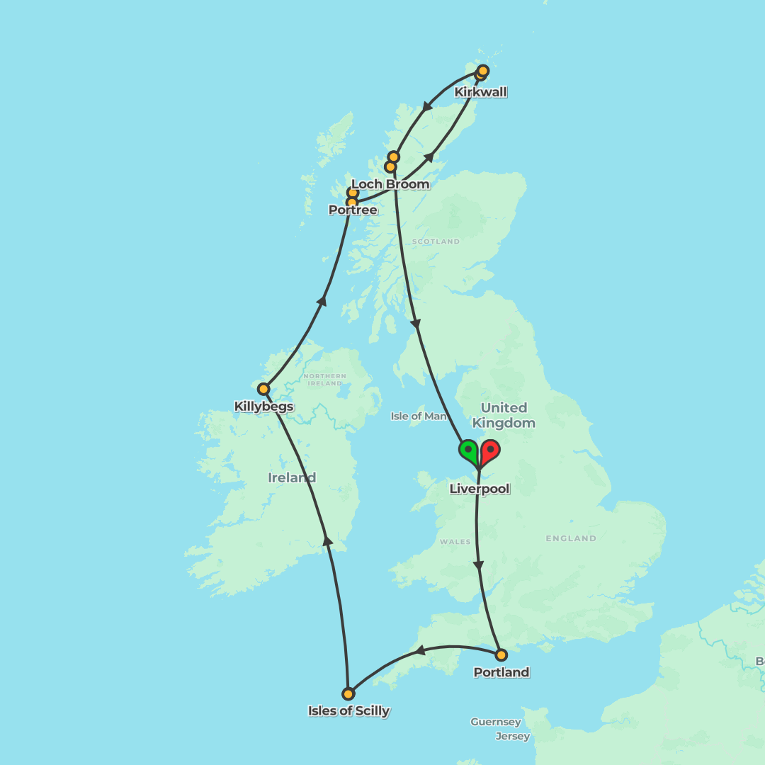 Throughout this itinerary, you stay aboard your cruise ship as it sails the British Isles, embarking and disembarking in Liverpool, with calls including Portland, St. Mary’s (Isles of Scilly), the Cliffs of Moher, Killybegs, Portree, Kirkwall, Loch Broom and Fingal’s Cave.