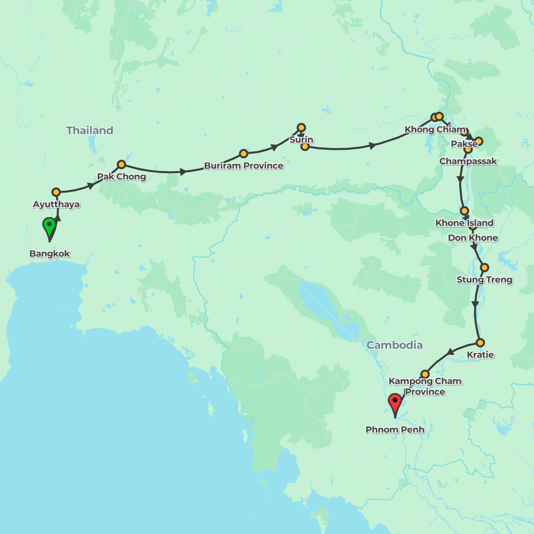 Stay in comfortable 3-star, en-suite, air-conditioned hotels, many with pools where possible, selected for location, comfort and convenience. Sample properties include Centara Life Phra Nakhon, Khao Yai Cottage, The Wood Surin, Peerada River View Resort, Pakse Hotel, Nakorn River View Champassak, Seng Ahloune Resort and Patio Hotel and Urban Resort.
