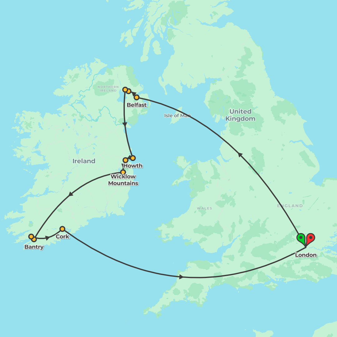 Accommodation features the Holiday Inn Express Dublin City Centre on Days 3–5, followed by The Maritime Hotel in Bantry on Days 6–7. Hotel names and locations are specified in the itinerary for these nights, aligning with visits in Dublin, Wicklow, Waterford and Cork.