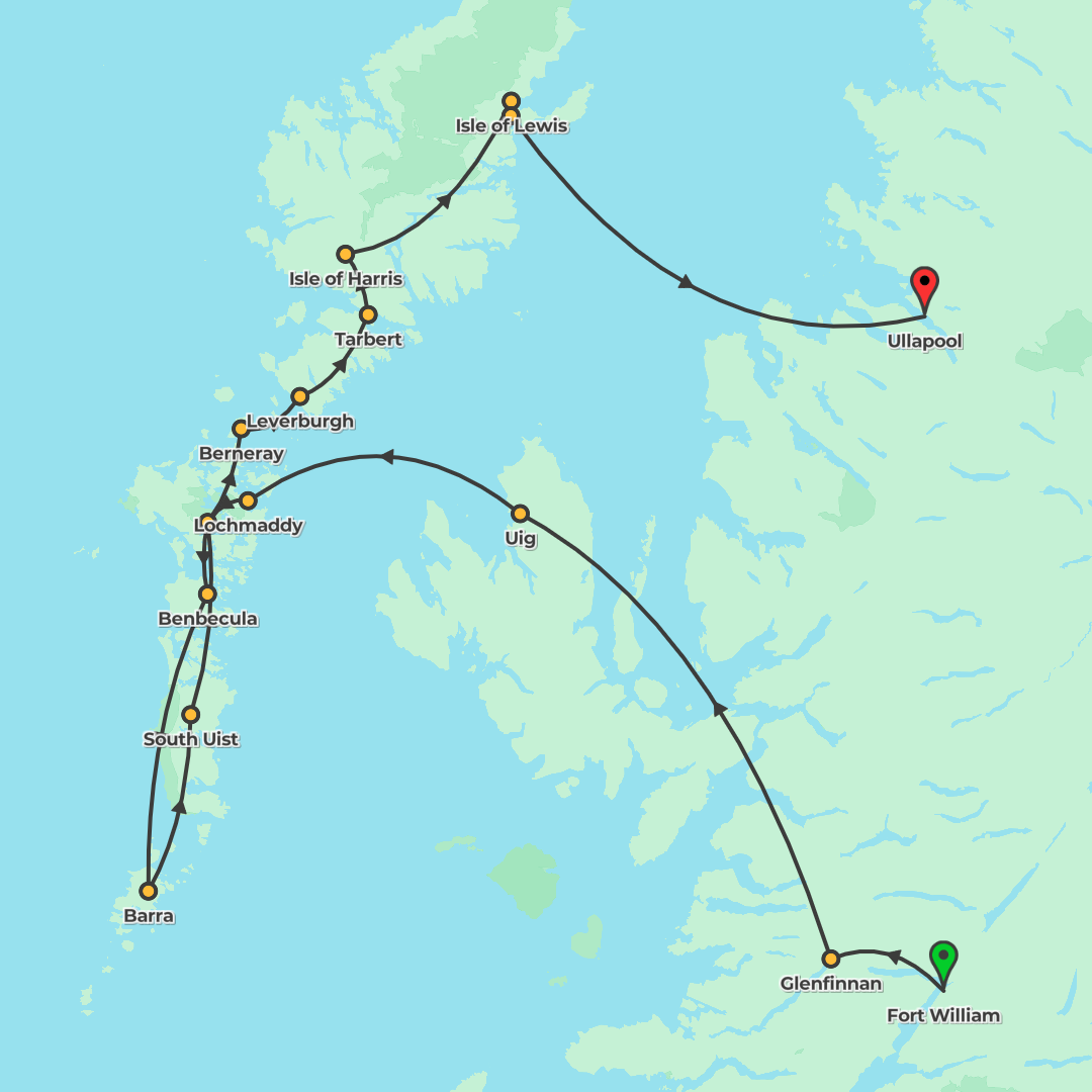 Discover the Outer Hebrides by coach and ferry, exploring ancient standing stones, traditional Black Houses and historic sites across Benbecula, Barra, Harris and Lewis.