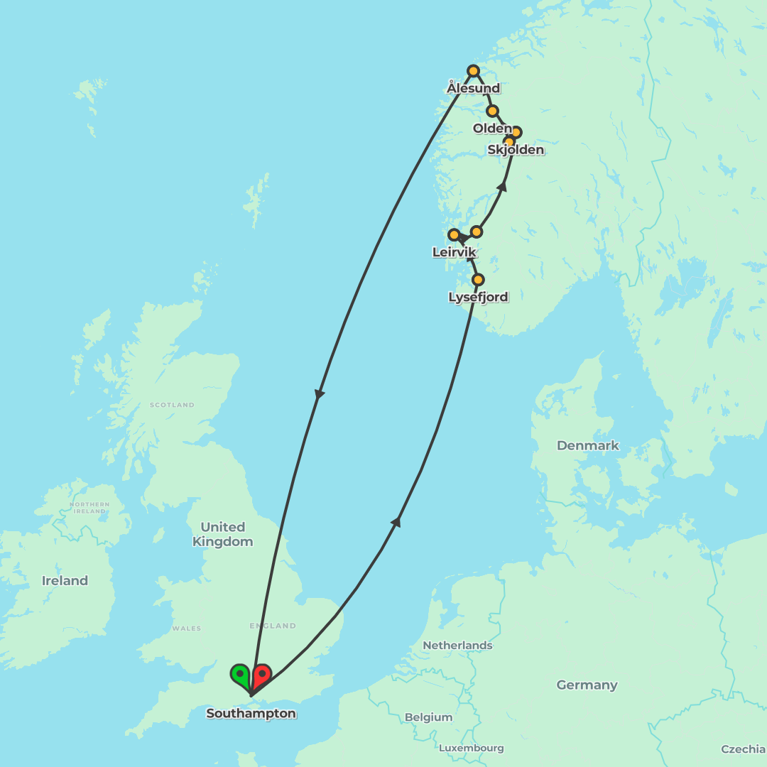 Sail round-trip from Southampton to explore Norway’s dramatic fjords with scenic cruising and charming port calls.