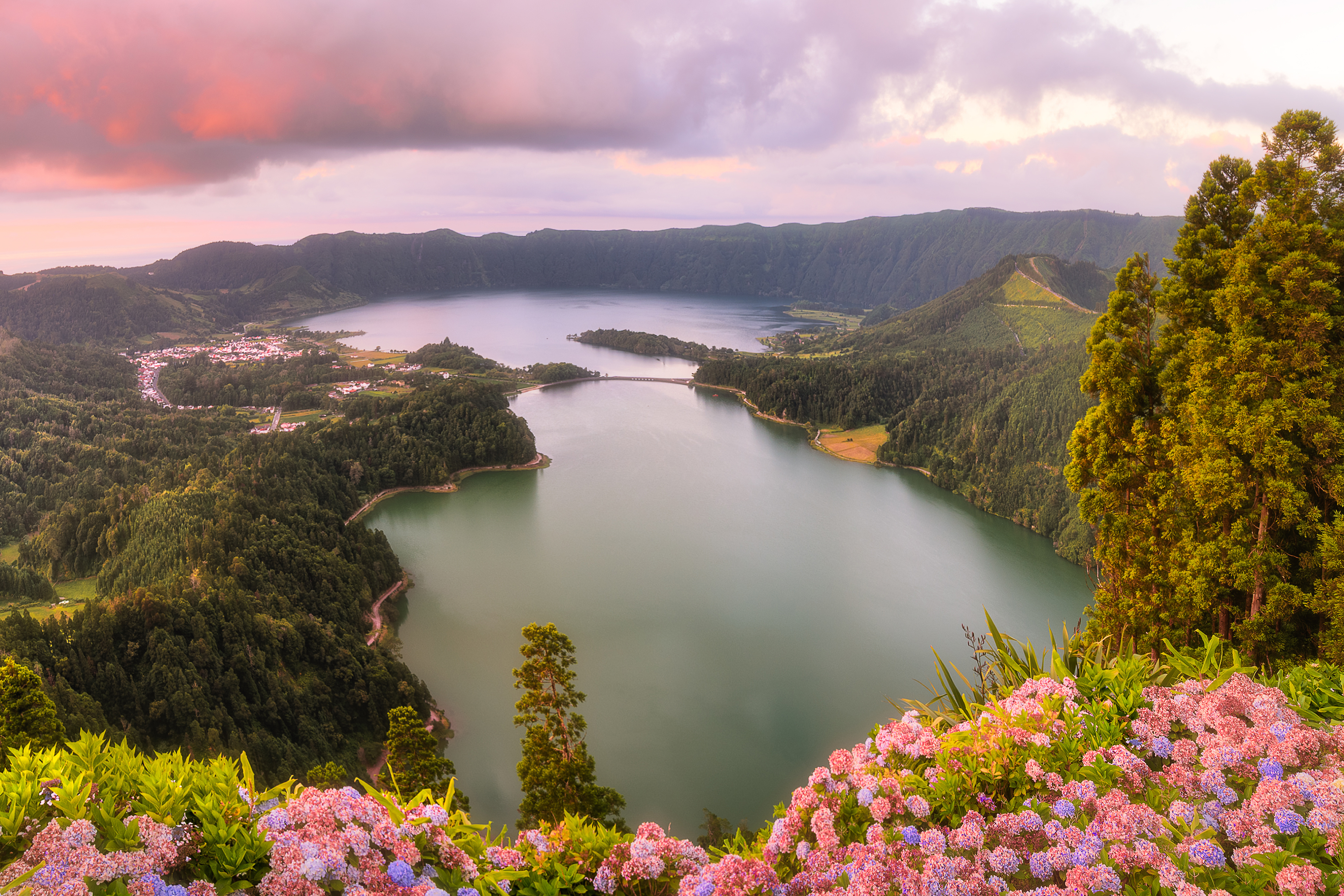 Hike volcanic highlands to the twin lakes of Sete Cidades.