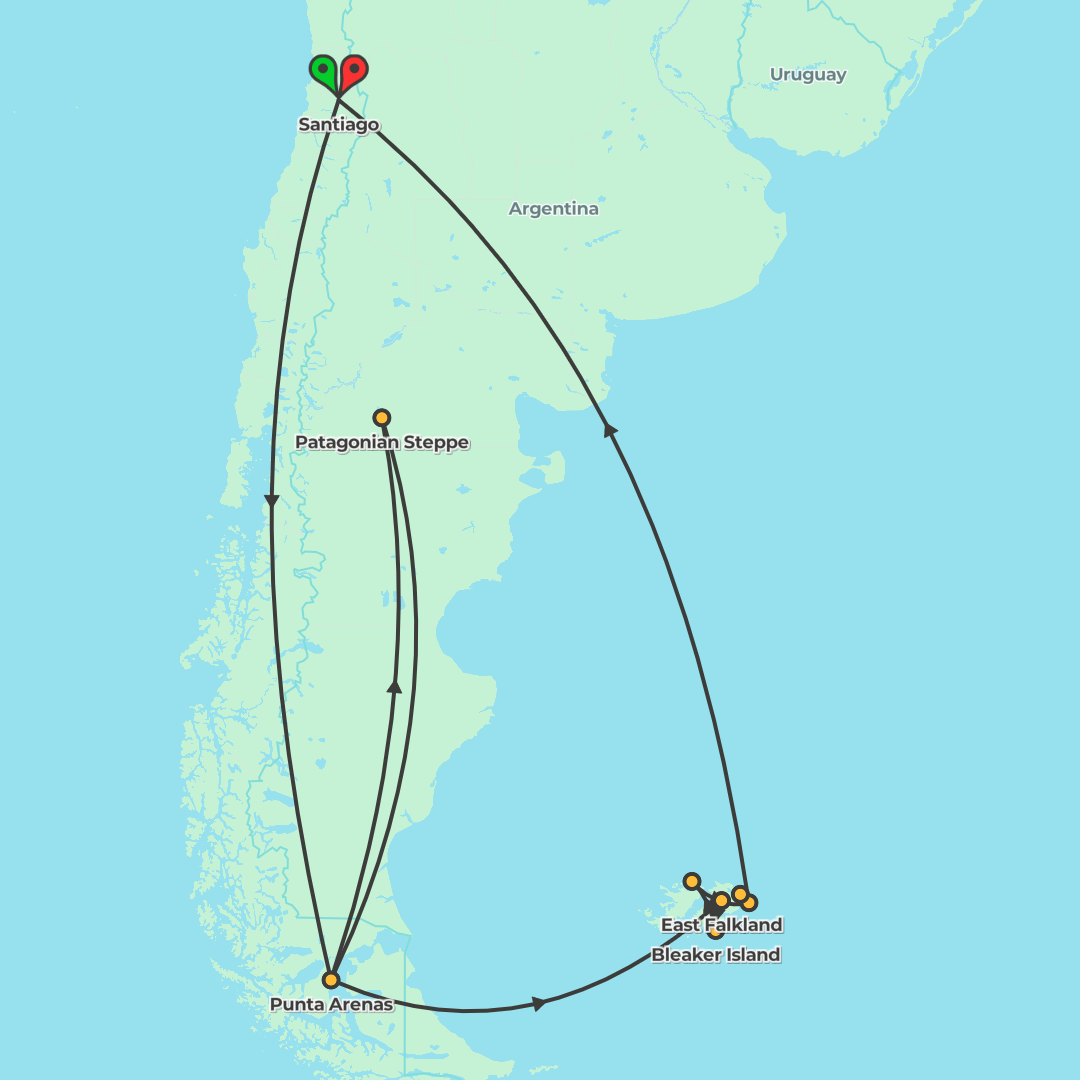 Discover Chile’s capital and Patagonia before flying to the Falkland Islands for remote landscapes and remarkable wildlife encounters.